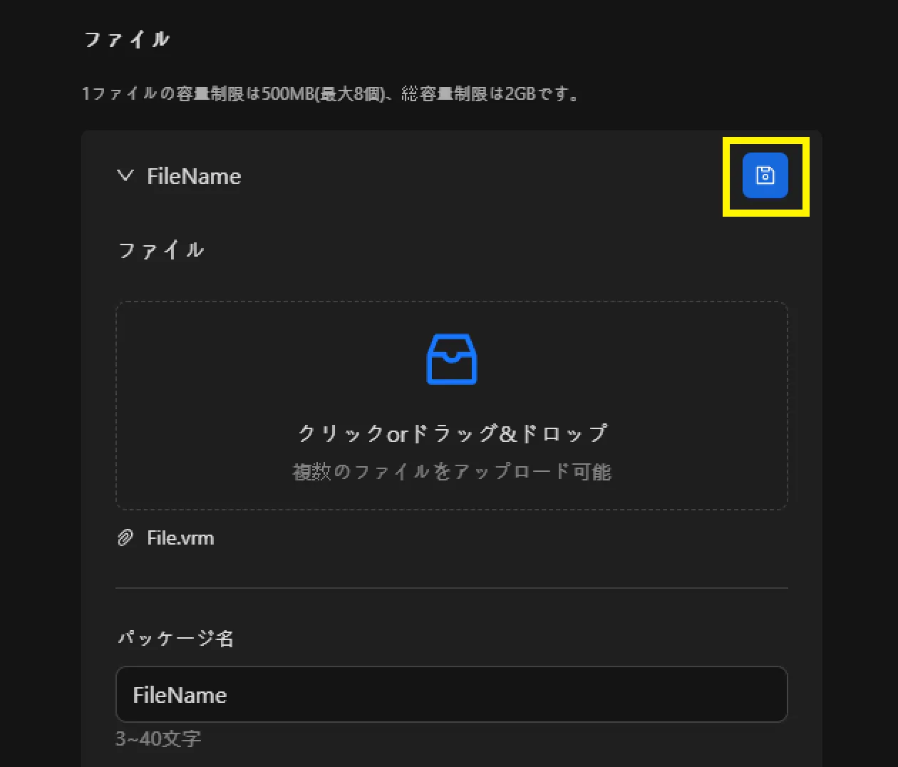 - 必須の内容をすべて入力した後、ファイルの形をしたアイコンをクリックして保存してください。