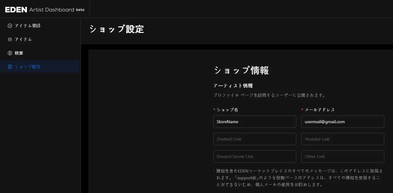 [アーティスト ダッシュボード] - [ショップ設定] で、ショップの基本情報を入力してください。