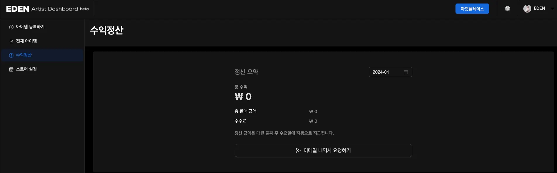 EDEN은 아이템 판매일 기준 익월 15일에 자동 지급해요.